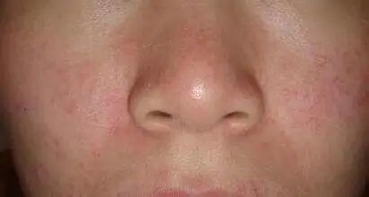 2. 玫瑰痤疮(酒渣鼻)。好发于面中部(鼻部、额头、下颌),以红斑和毛细血管扩张为主。