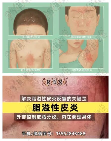 1、发生在额面部、背部等皮脂腺分泌旺盛的地方会出现红斑,附有白色的鳞屑,伴有严重的瘙痒。