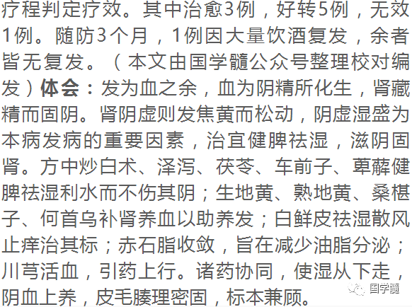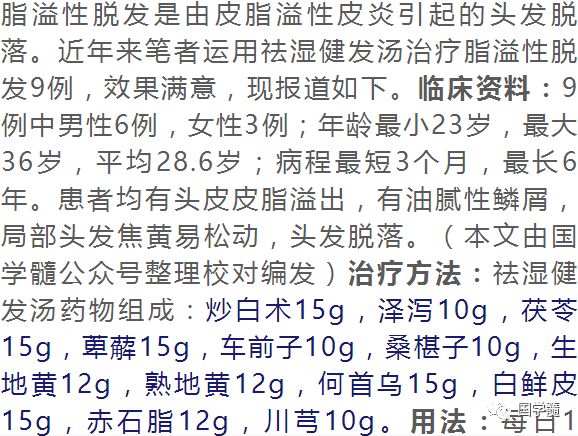 脂溢性脱发,西医称雄激素源性秃发,是一种以皮肤油脂溢出为主,并伴有额颞顶部脱发的皮肤病。其早期临床表现为头皮部及发油脂多、屑多并伴有瘙痒感,继而额颞顶部毛发变稀疏,毛发囊萎缩,头皮发亮。针对脂溢性脱发,如何根治是目前医学所面临的难题。西药常运用促使毛发囊生发的米诺地尔、抑制雄性激素的非那雄胺以及雄激素拮抗药、雄激素受体阻断剂、芳香酶活性增强剂、抗菌药、糖皮质激素、环孢素A等进行治疗,虽有疗效,但难以彻底治愈,且有一定的不良反应。而诸多中医家认为脂溢性脱发的病机主要以肝肾亏虚为本,以风、湿、热、痰、瘀等毒邪侵蚀为标,治疗以滋补肝肾为主,佐以祛风除湿或活血祛瘀等扶正祛邪之法。(本段内容摘自:《从湿热体质论治脂溢性脱发》作者:夏靖,倪诚,北京中医药大学中医体质与生殖医学研究中心,《天津中医药》2019年第12期P1149-1152页)