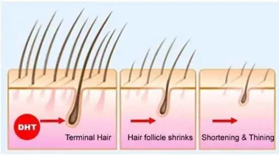 DHT呈现在人体不同位置对于毛发的影响是不一样的,它在发际线和头顶部位是向毛母细胞传达抑制毛发生长的信号,而在眉毛以下它的信号则是刺激成长。