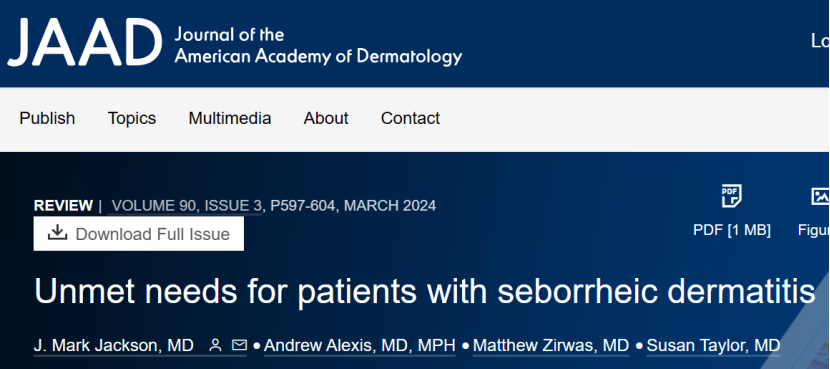[1]Jackson JM, Alexis A, Zirwas M, Taylor S. Unmet needs for patients with seborrheic dermatitis. J Am Acad Dermatol. 2024 Mar;90(3):597-604. doi: 10.1016/j.jaad.2022.12.017. Epub 2022 Dec 17. PMID: 36538948.