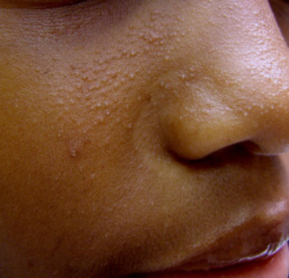 面部特征包括面部中间三分之一的典型对称病变模式,包括脸颊、前额中央、鼻唇和鼻翼褶皱、眉毛、耳后和外耳道。