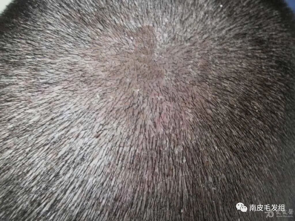 开始为轻度潮红斑片,上覆灰白色糠状鳞屑,伴轻度瘙痒,皮疹扩展,可见油腻性鳞屑性地图状斑片。严重者伴有渗出、厚痂、有臭味,可侵犯整个头部。头发可脱落、稀疏。