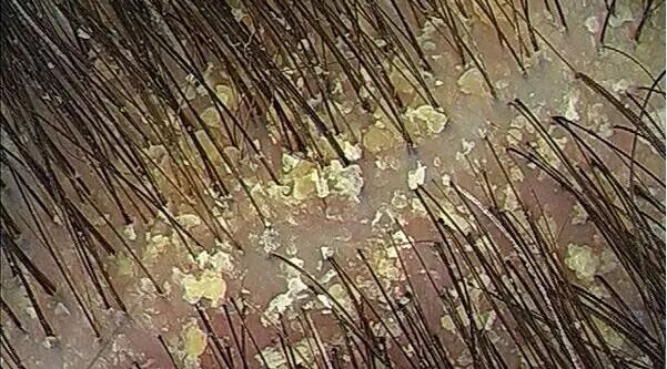 能清晰的看出来,头发里这些油腻的、白或黄色的皮屑。