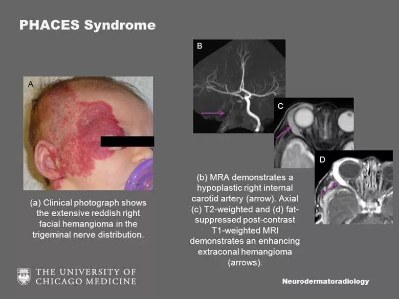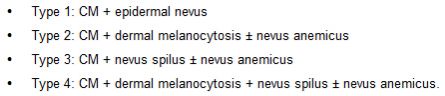 葡萄酒色斑,还可与表皮痣、蒙古斑、黑素细胞痣、贫血痣一起生成四种不同混搭类型的色素血管性斑痣性错构瘤病 phakomatosispigmentokeratotica*。