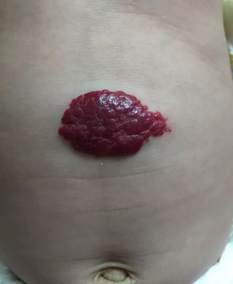 前面说的鲜红斑痣/葡萄酒色斑就是血管畸形,真正的血管瘤通常是上图这种草莓状或海绵状的,表面不平坦。