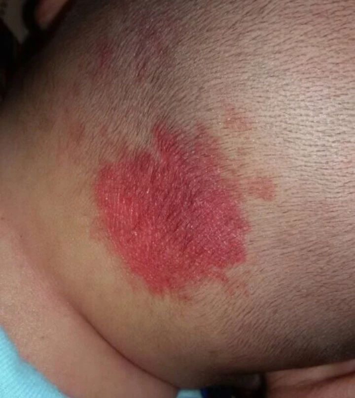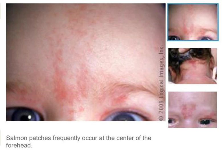 这种长在前额或眼睑、后项处的红斑很常见,也叫鲑鱼斑 salmon patches,皮损特点表现为长在身体中线部位的不规则红斑 ,压之褪色,哭闹时候明显。