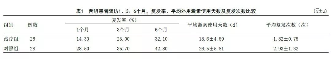 HP阳性56例,感染率71.8%,阳性患者复发次数(5.28±2.19)次,高于22例阴性患者的(3.18±1.68)次,有显著性差异(P <0.05)。治疗组患者1、3、6月复发分别为14.3%、25.0%、32.1%,对照组患者1、3、6个月复发率28.5%、35.7%、42.8%,两组复发率比较,有显著性差异(P <0.05);治疗期间,治疗组平均激素使用天数(18.6±4.89)d,对照组(26.5±5.81)d,治疗组平均复发次数(1.82±0.78)次,对照组(2.93±1.32)次,治疗组均明显低于对照组,比较有显著性差异(P <0.05)。