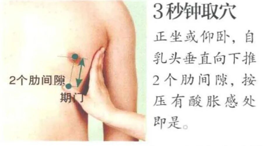 找法:自乳头垂直向下推2个肋间隙(乳头平第四肋间隙),按压有酸胀感处,即为本穴