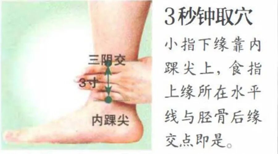 位置:在小腿内侧,当足内踝尖上3寸,胫骨内侧缘后方。