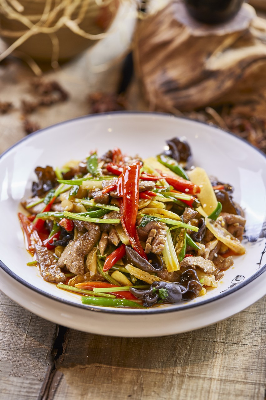 4、再放入木耳丝及葱炒匀,加少许糖、盐调味即可上碟。