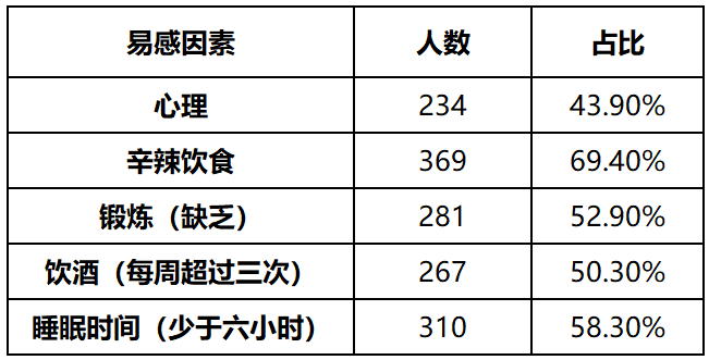 脂溢性皮炎受多种因素影响,其中,影响最为严重的有五种,分别为心理、辛辣饮食、锻炼、饮酒、睡眠时间。有研究取532例出现头屑、头痒、爱出油症状的脂溢性皮炎患者,研究上述易感因素的出现比例,可见下表[3]。