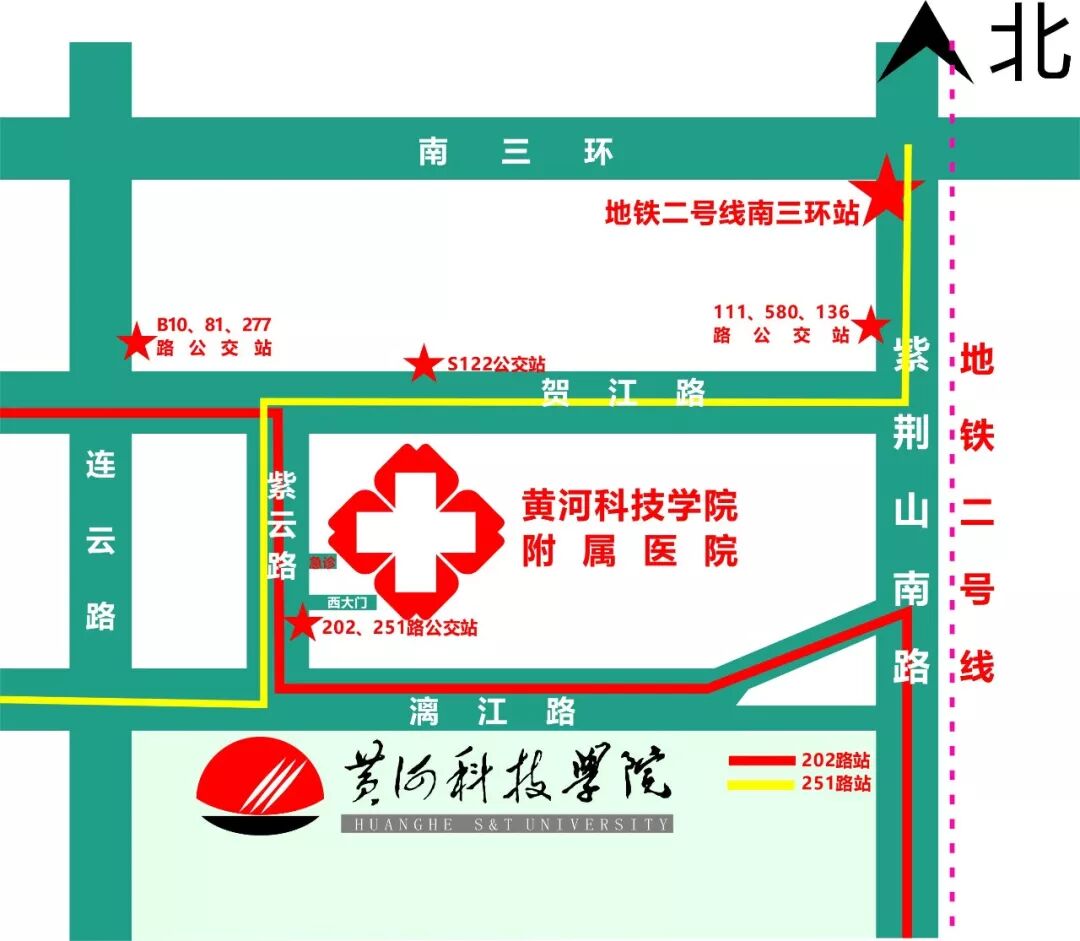 1、乘202路、251路到黄河科技学院附属医院站下车即到;