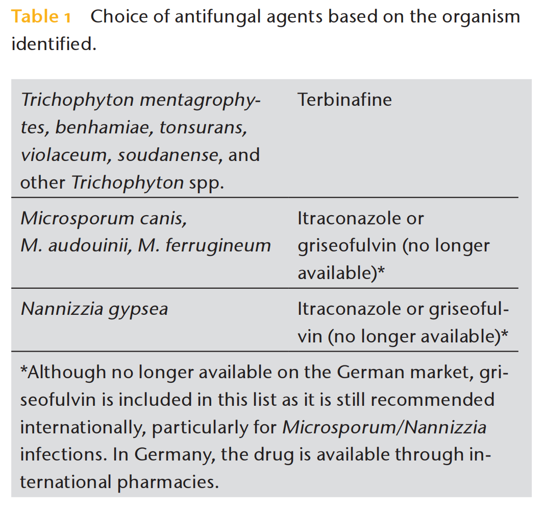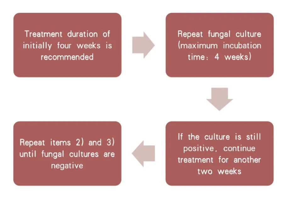 在治疗开始之前,需要进行精确的诊断检查,包括直接镜检、培养或采用分子生物学方法完善菌种鉴定,以确定最佳抗真菌药物及其给药剂量和治疗时间。对于脓癣患者或临床表现高度提示TC但PCR等快速诊断方法不可用和/或显微镜检查结果不确定时,可以在培养结果回示前立即开始治疗。