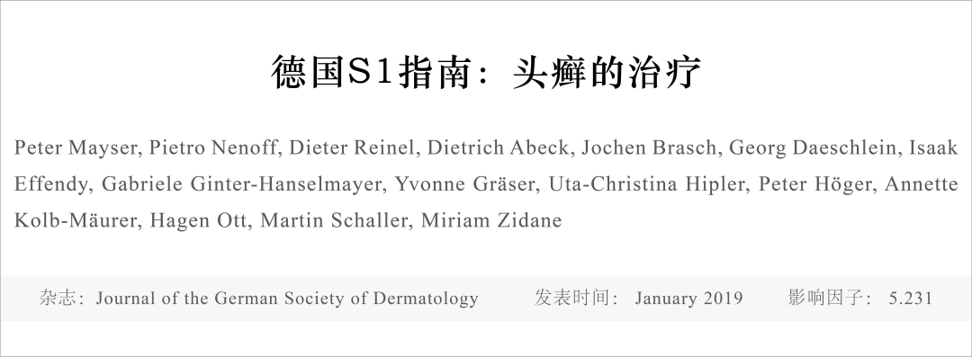 德国指南推荐的治疗目标包括以下4个方面:真菌学治愈(镜检及培养均为阴性)、症状缓解、预防永久性脱发、阻止病原体进一步传播。为了达到上述目标,系统及局部治疗均需使用。