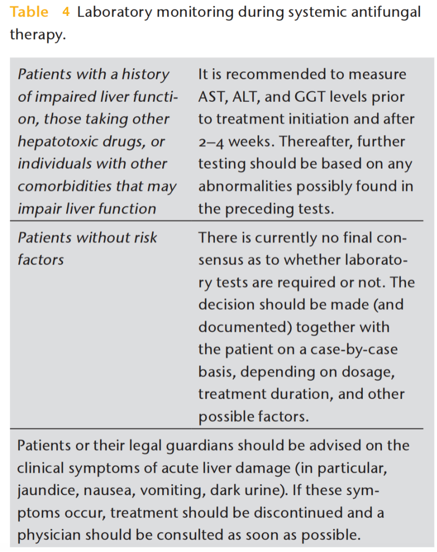 关于头癣的治疗流程如下图所示。根据病史、病原学检测及当地流行病学选择合适的药物开始初始治疗后,应至少每4周进行1次真菌培养,若为阳性则继续治疗2周,直至结果为阴性。在治疗期间,应密切监测患者肝肾功能。