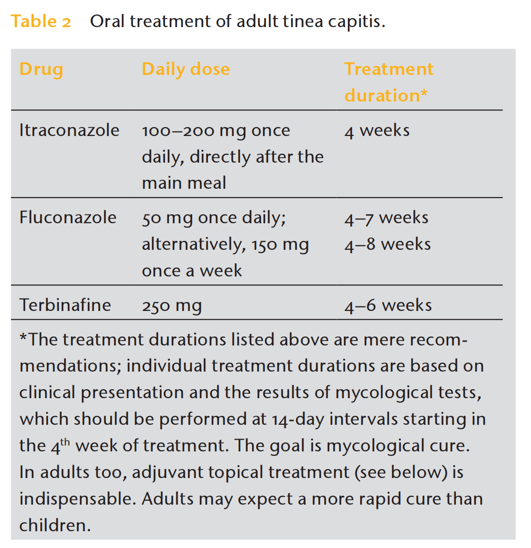3.接触者治疗:推荐只有在社会接触者有明显TC(间隔两周症状时才对其进行全身抗真菌治疗。无症状接触者可仅使用外用抗真菌药物,如抗真菌洗发水,并需定期随访),以确保治疗成功。