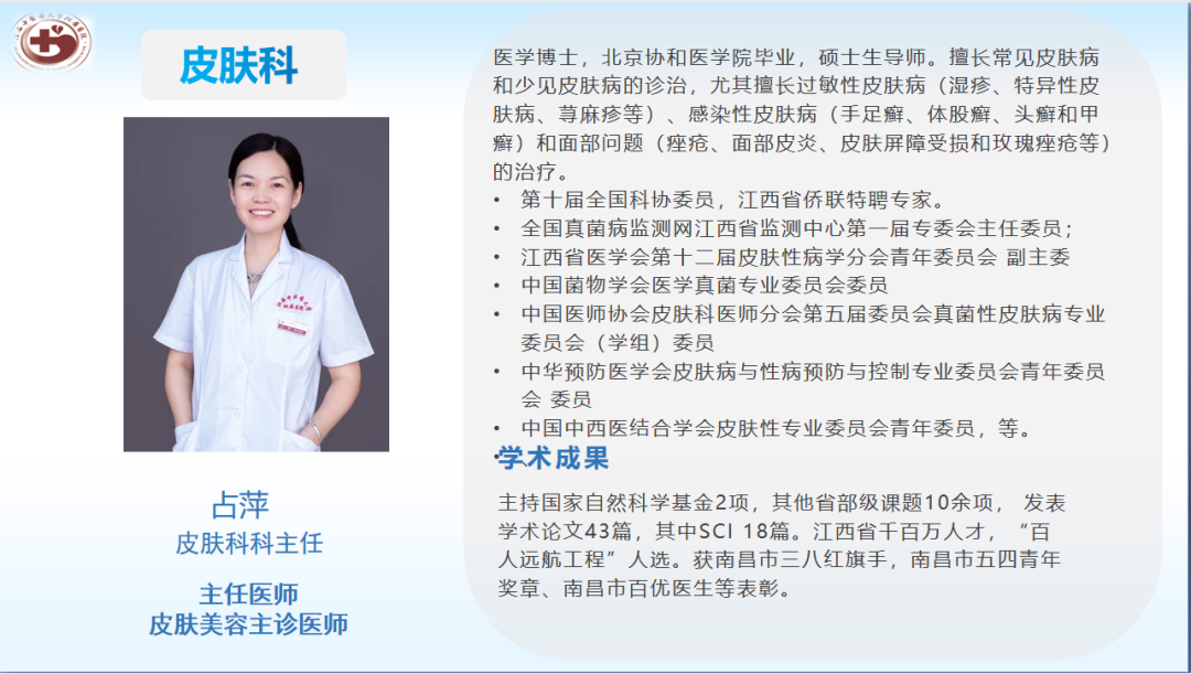 特别提示:有真菌感染性疾患的患者,建议周六下午和周四上午到东湖院区找具有丰富经验的占萍博士就诊,她将为您提供最为精确的指导和治疗方案。