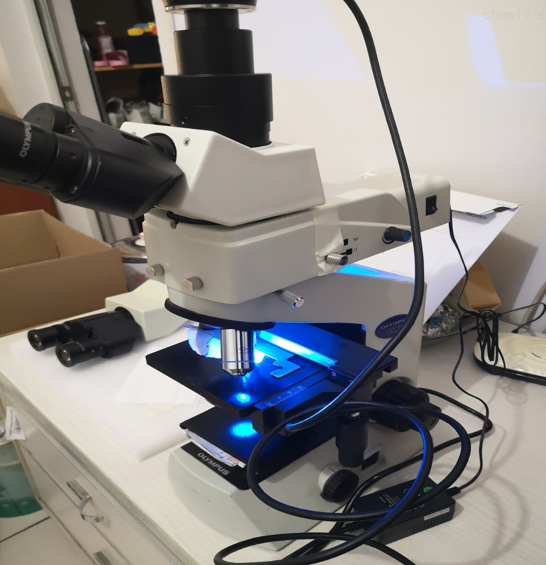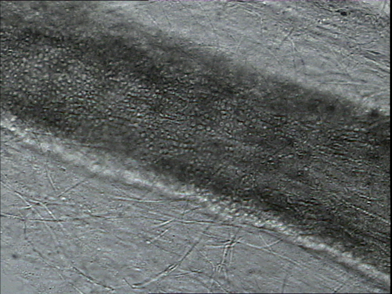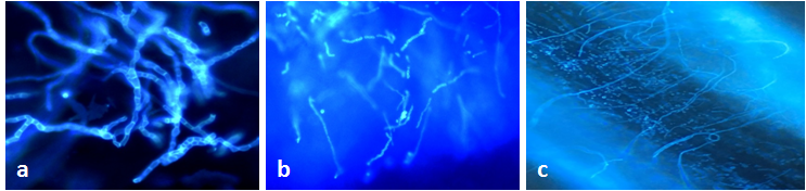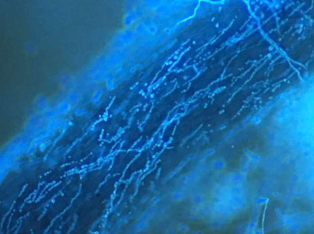 (荧光显微镜下可见头发上镶嵌大量真菌菌丝和孢子)