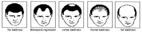 男性发生雄激素性脱发的几种形态,从左至右依次为:不秃,双颞侧秃发,头顶秃发,额骨秃发,全秃(Cranwell and Sinclair 2016)
