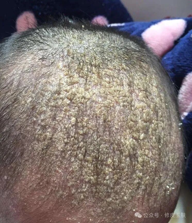 鳞屑可以在婴儿及儿童时期开始出现,有的患者到青年粘连头发而被称为脂样糠疹。