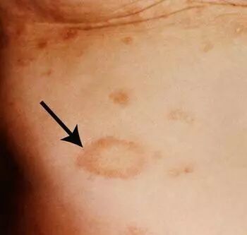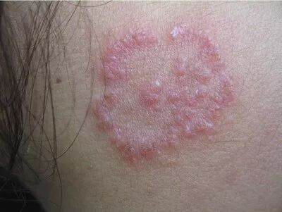 2、体癣。体癣损害边缘隆起而狭窄,界限清楚,有从中央向周围扩展的环状损害。体癣瘙痒明显,患者往往有手足甲癣的病史。