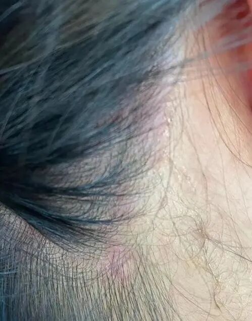 皮损可能延伸至耳后区域 (常出现皲裂、渗出和结痂)及外耳道和耳甲,有时伴有明显瘙痒和二重感染(外耳道炎) 。