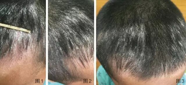 近期接诊了一位7岁男性患儿,主诉为头皮脱屑伴轻度瘙痒6个月,患病期间皮损面积逐渐扩大,曾用康王洗剂效果差。患儿精神、饮食、睡眠可,其余未发现明显异常。皮损情况请见图1~3。