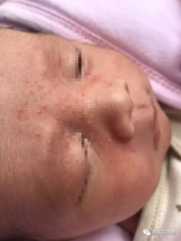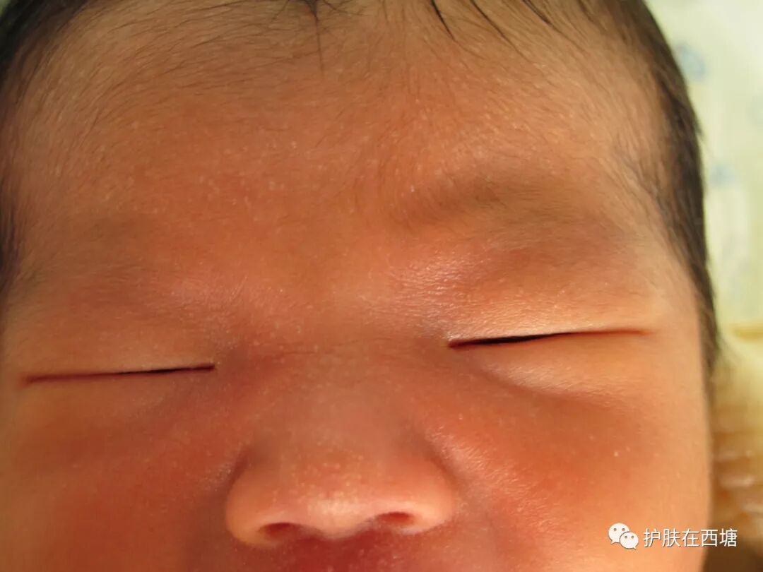 新生儿痤疮:可表现为红色点状丘疹,上有白色脓头,主要跟婴儿从母体出生后,激素水平有关,一般可自愈。