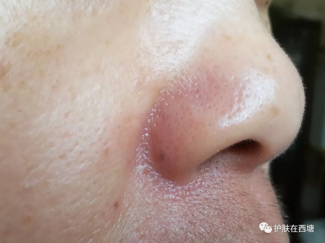 面部,特别是眉部、鼻唇沟可见油腻性细小的鳞屑,基底发红,周围可以有散在红色小丘疹。