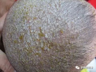 头部,早期可表现为片状灰白色糠秕状鳞屑,基底稍红,轻微瘙痒。有认为头皮屑(头皮糠疹)许多时候就是轻度脂溢性皮炎的表现。偏干燥者既往称为干性脂溢。重者表现为地图状红色斑片、油腻性鳞屑,可伴有渗出及厚痂,散发腥臭味。