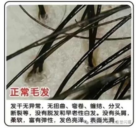 正常毛发的发干无异常,无扭曲、弯卷、缠结、分叉、断裂等,没有脱发和早老性白发。没有头皮屑,柔软富有弹性,发色亮泽,表面光滑。
