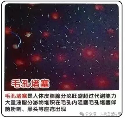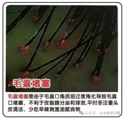 毛囊堵塞是由于毛囊口角质层过度角化导致毛囊口堵塞,不利于皮脂腺分泌和排泄,平时多注意头皮清洁,少吃辛辣刺激油腻食物。