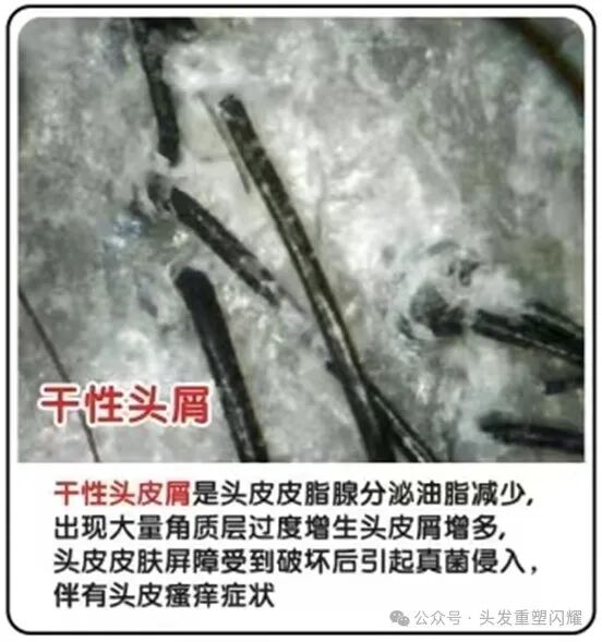 是头皮皮脂腺分泌油脂减少,出现大量角质层过度增生使得头皮屑增多,头皮皮肤屏障受到破坏后引起真菌侵入,伴有头皮瘙痒症状。