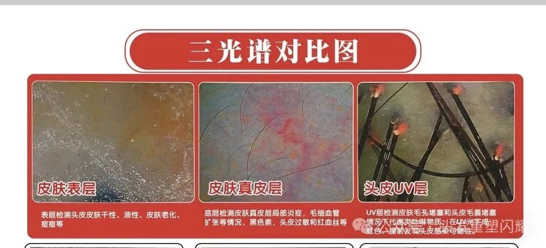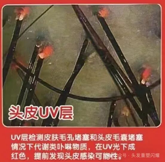 UV层检测皮肤毛孔堵塞和头皮毛囊堵塞的情况下,代谢类卟啉物质在UV光下呈红色,提前发现头皮感染可能性。