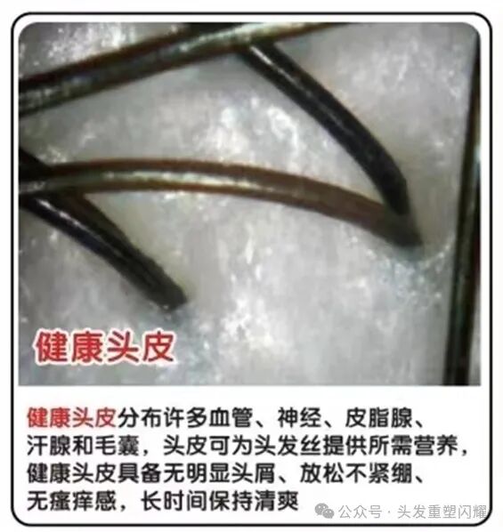健康头皮分布许多血管、神经、皮脂腺、汗腺和毛囊。