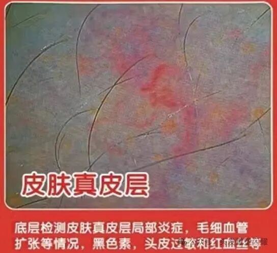 底层检测皮肤真皮层局部炎症,毛细血管扩张等情况,黑色素、头皮过敏和红血丝等。