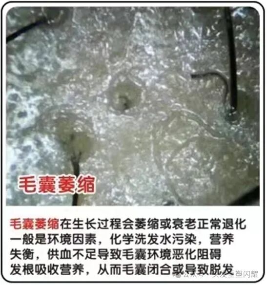 毛囊在生长过程中会萎缩或衰老、正常退化。一般是环境因素、化学洗发水污染、营养失衡、供血不足导致毛囊环境恶化,阻碍发根吸收营养,从而毛囊闭合或导致脱发。
