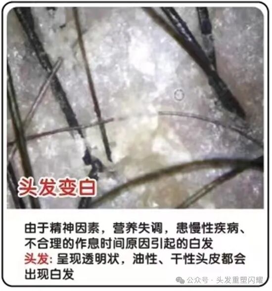 由于精神因素、营养失调、患慢性疾病、不合理的作息时间等原因引起的白发。头发呈透明状,油性、干性头皮都会出现白发。