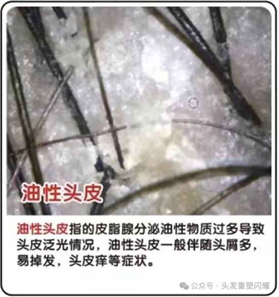 指的是皮脂腺分泌油性物质过多,导致头皮泛光。油性头皮一般伴随头皮屑多、易掉发、头皮痒等症状。