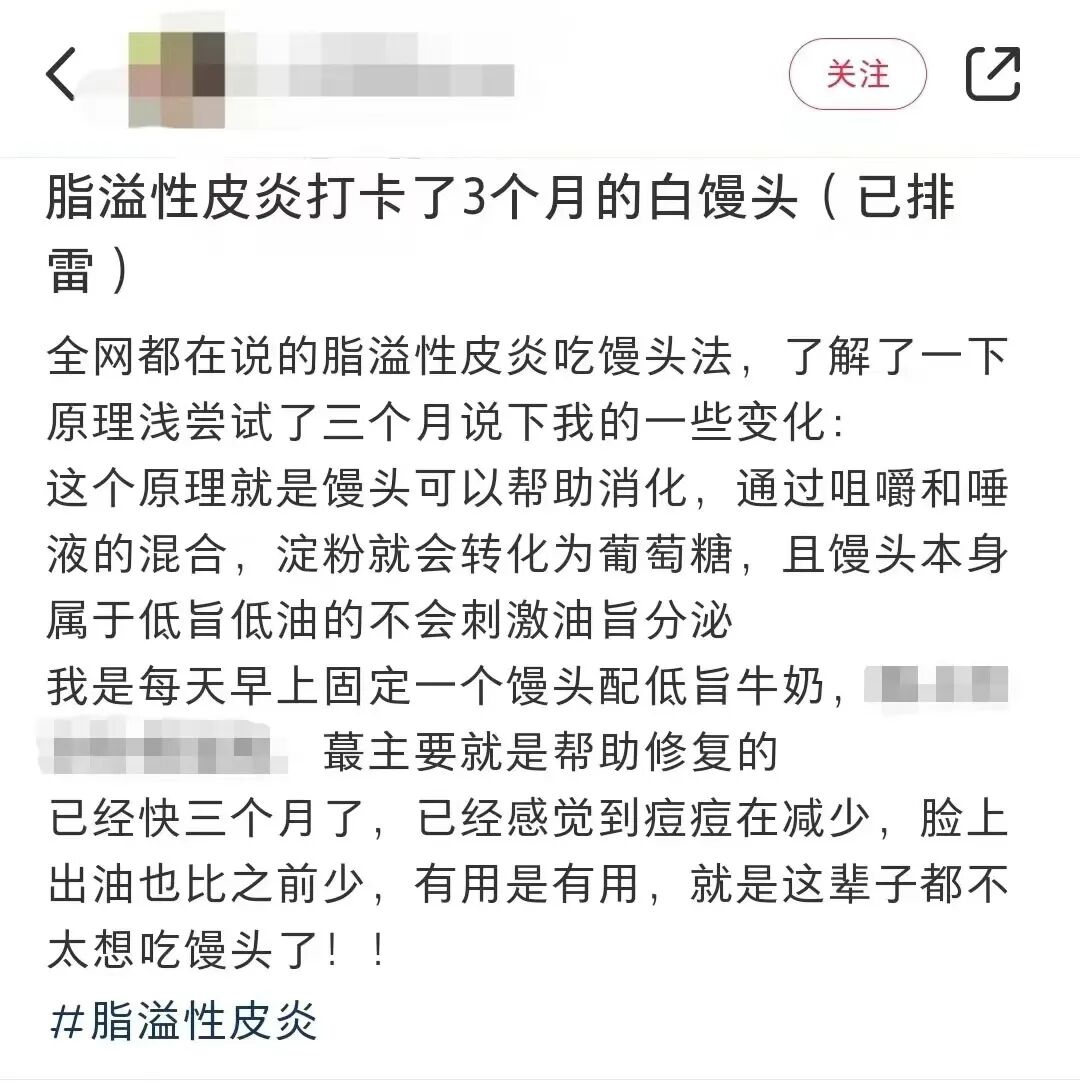 馒头对于缓解脂溢性皮炎的帮助,或许只能体现在它与其他主食相比,不会刺激皮脂分泌。但其成效甚微,且未有临床研究证明!想要靠啃馒头来治疗真的duck不必~