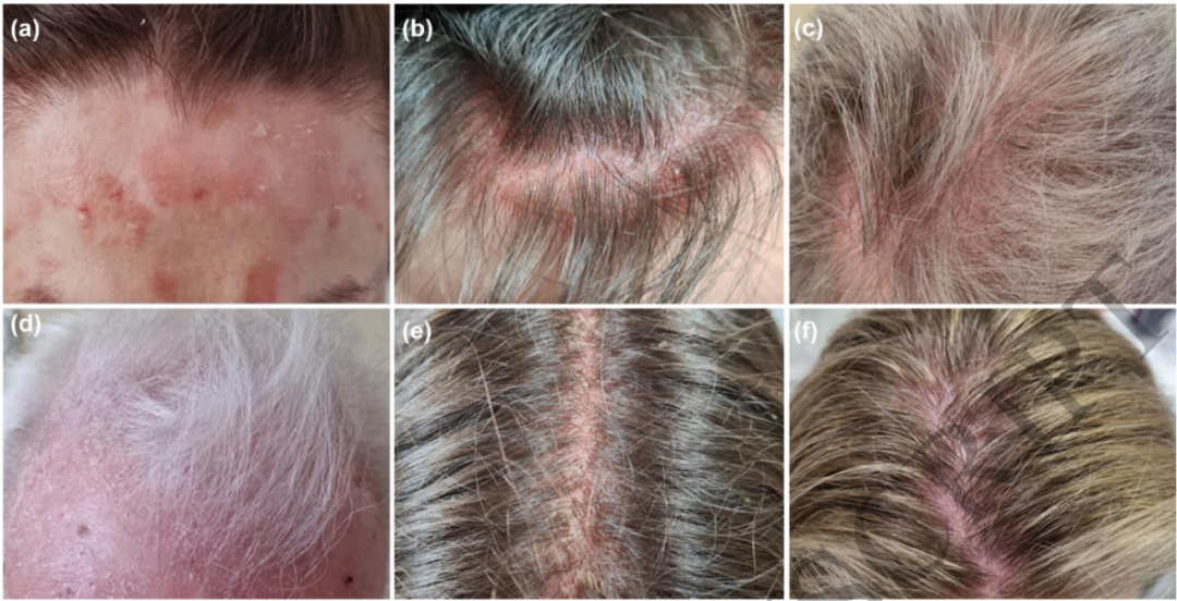 图 1 .(a)银屑病;(b)脂溢性皮炎;(c)弥漫性扁平苔藓;(d)接触性皮炎;(e)皮肌炎;(f)头皮玫瑰痤疮(图源:Waśkiel-Burnat A 等 2023)