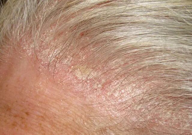 严重的头皮牛皮癣可能会出现强烈的炎症,并且在增厚的斑块上出现红色和银色薄片,这些斑块延伸到头皮区域之外。