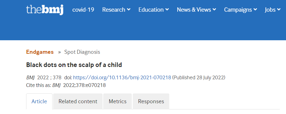 皮肤科团队随后把这一典型病例发表在了《英国医学杂志(The BMJ)》上。这种真菌传染性很强,而且会导致毛干断裂,头皮出现黑点,引起脱发。
