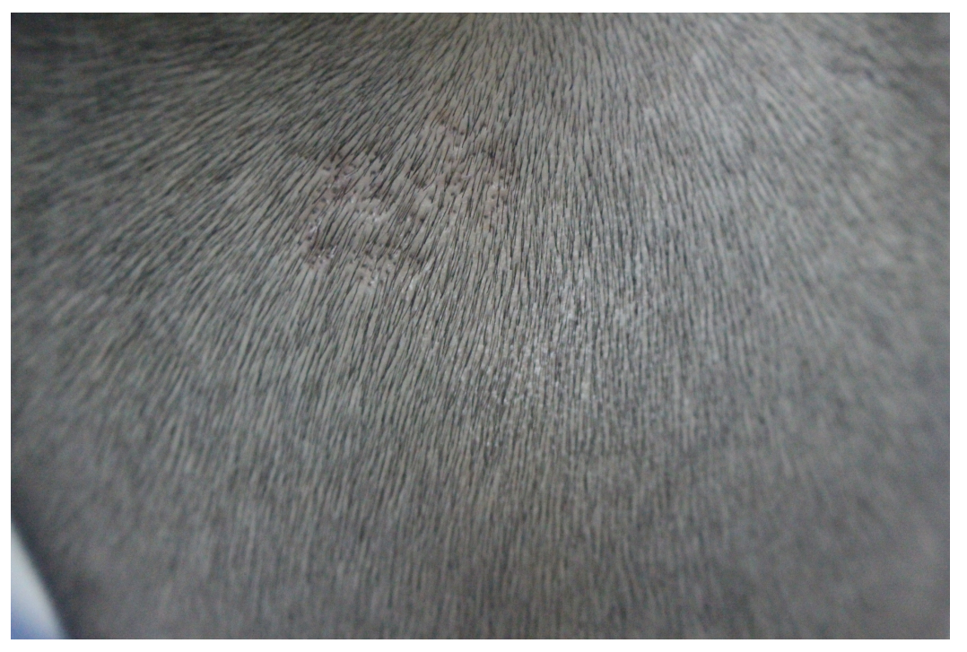 这是一种发生在头皮和头发上的常见皮肤真菌感染,其特征是成片的脱发,毛干在头皮水平断裂,导致头皮上出现黑点。因为孢子位于毛干内,毛内癣菌感染通常会引起头皮糠疹状鳞屑。