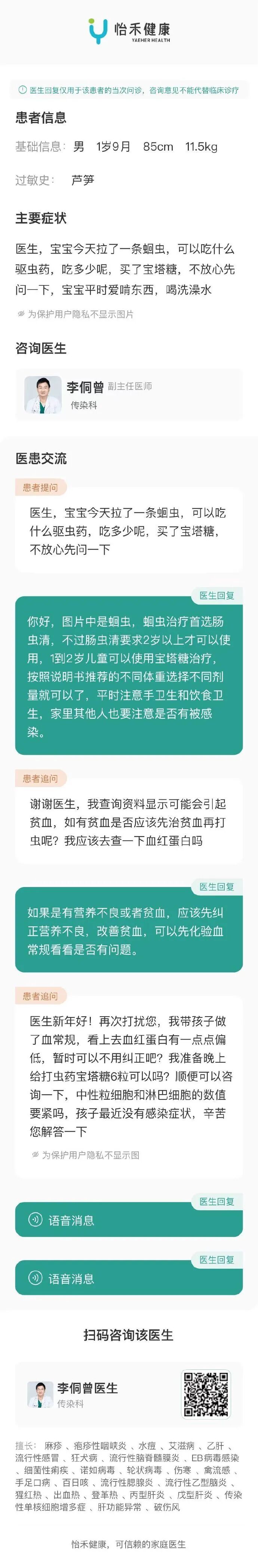 怡禾健康感染科李侗曾医生回复儿童感染蛔虫。健康群宝妈:我刚刚经历了一个恐怖事件,我娃拉虫了,一条营养过剩的蛔虫,吓死本宝宝了!我娃这么瘦,它怎么下得去口!建议你们自行百度,粉红色的蛔虫,长长的,还能看见内部结构!