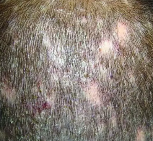 ②典型皮损毛根处皮肤发红,形成小丘疹,继而变成脓包,干燥后形成黄痂,除去黄痂,可见鲜红湿润糜烂面或溃疡。愈后形成萎缩性瘢痕,遗留永久性秃发。黄痂较厚处,易发生细菌继发感染,有鼠臭味,自觉剧痒。