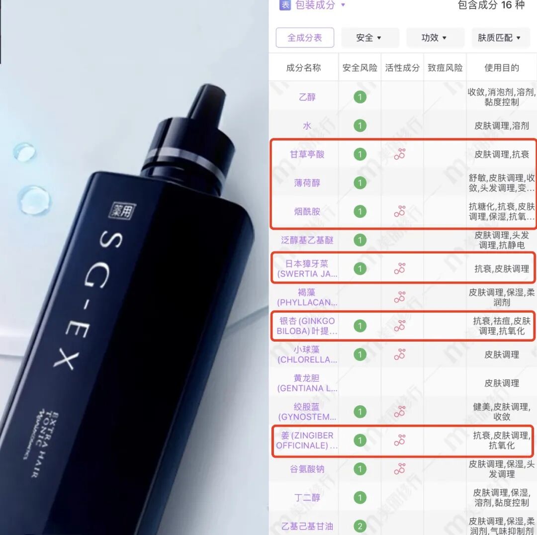 配合促进血液循环的人参根提取物及苦参根提取物、以及抗炎的甘草亭酸,是一款比较全能的防脱育发的产品。