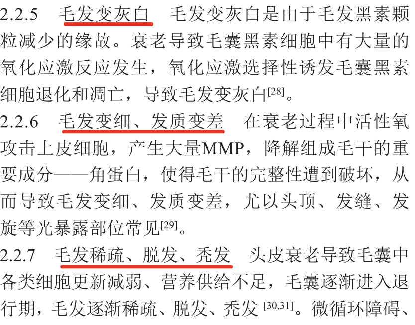 受年龄增长、外界损伤的累积,毛囊干细胞的活力会逐渐下降,导致毛囊退化,出现新生毛发细软、白发、甚至无毛发再生的衰老现象。