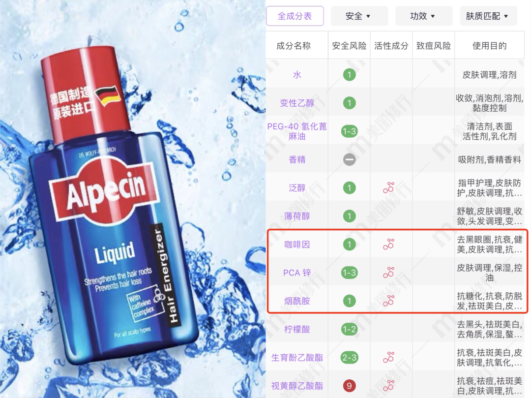 欧倍青咖啡因免洗滋养液,除了主打的咖啡因之外,还有烟酰胺、PCA锌等控油成分,适合大油头。